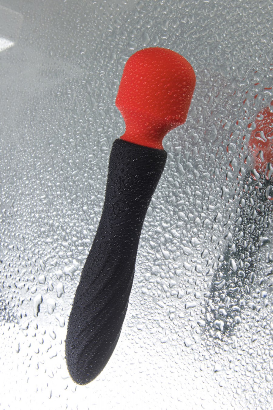 С одной стороны классический массажер-ванд красного цвета. Его головка диаметром 4,3 см легко скользит по внешним эрогенным зонам, снимая напряжение и возбуждая нервные окончания.